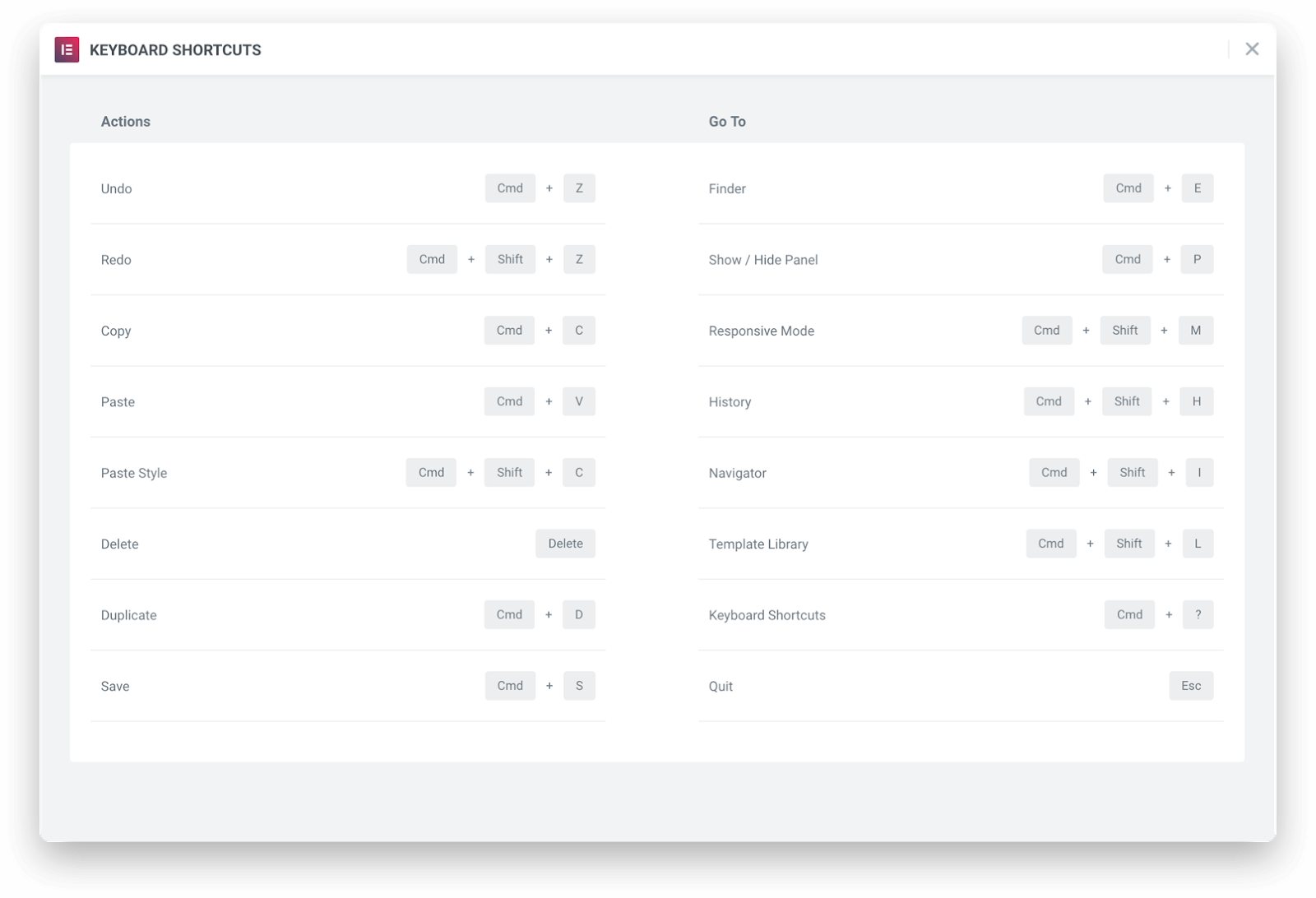 - Ctrl+E / Cmd+E: 開啟 Elementor Finder (快速搜尋功能)
