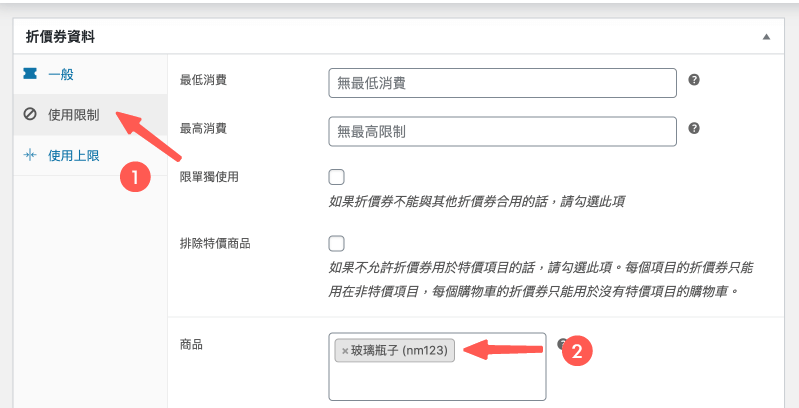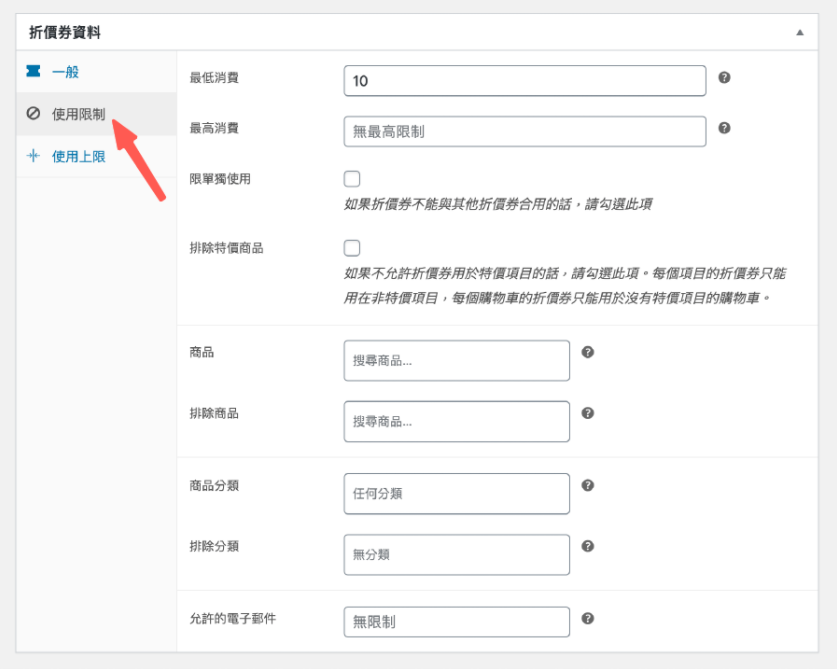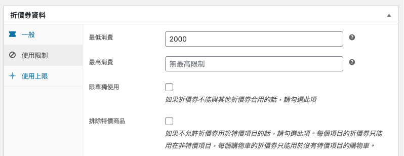 • 限制 X 項目的使用上限(因為選擇 “固定的購物車折扣” ,所以沒看到) :購物車有多少個商品,可以套用此折價券優惠。舉例:如果設定為 1,就只有一個商品會套用折扣。
