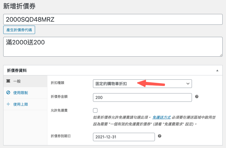 再來製作滿 2000 送 200 元的,折扣種類一樣選取「 固定的購物車折扣 」,到期日期選年底。