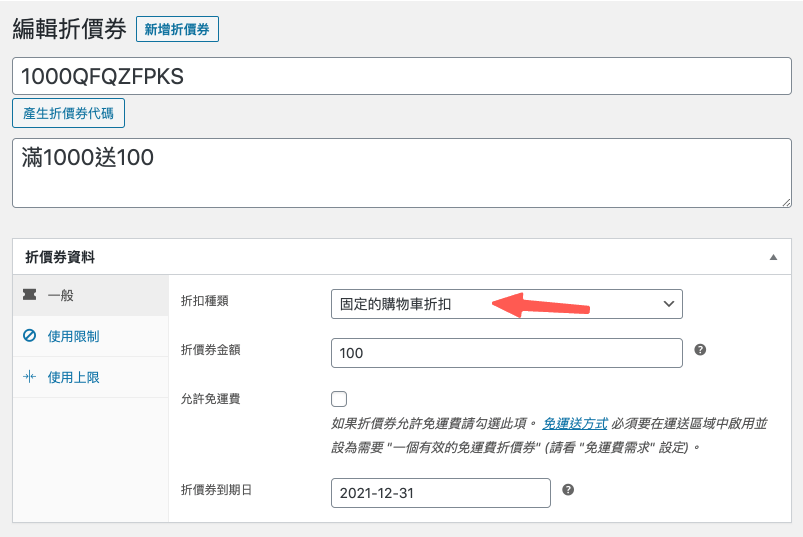 這裡示範使用 “固定的購物車折扣” 類型,只要用這張折價券,就能折抵 100 元(不包括運費),還有到期日期。