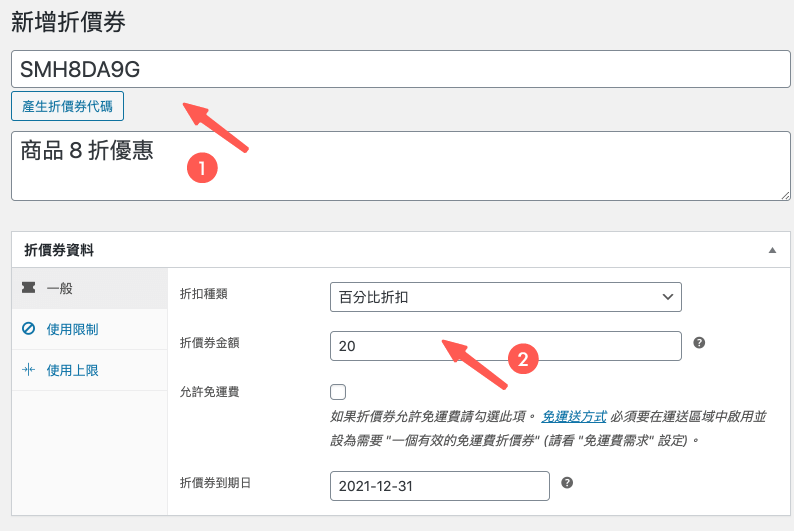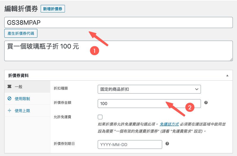 • 折價券到期日:設定有效期限。建議需前往 WordPress 設定 > 一般,調整台灣正確時區(UTF+8)、日期格式、時間格式,這樣時間才不會有誤。
