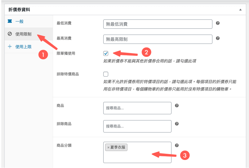 把 “限單獨使用” 打勾(無法和其他折價券同時使用),設定 “夏季衣服” 分類下的商品才能用。