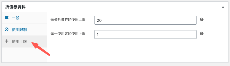 • 每張折價券的使用上限:限制折價券的使用次數。舉例:如果設定為 10,被使用超過 10 次就會自動失效。