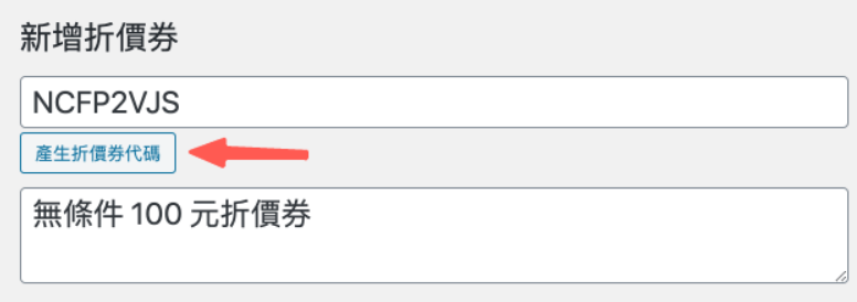 命名折價券序號,注意這裡需填寫唯一值,建議填寫英文,如果不知如何命名,可點「 產生折價券代碼 」,WooCommerce 會用演算法取名。