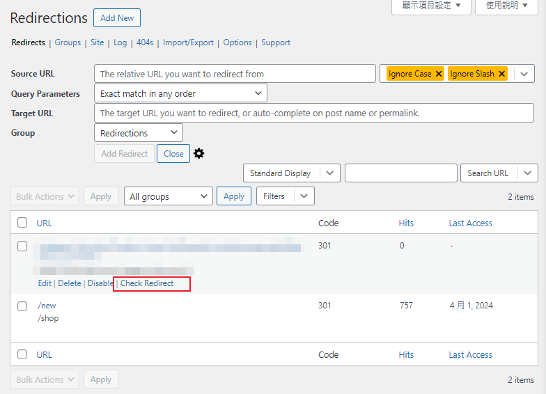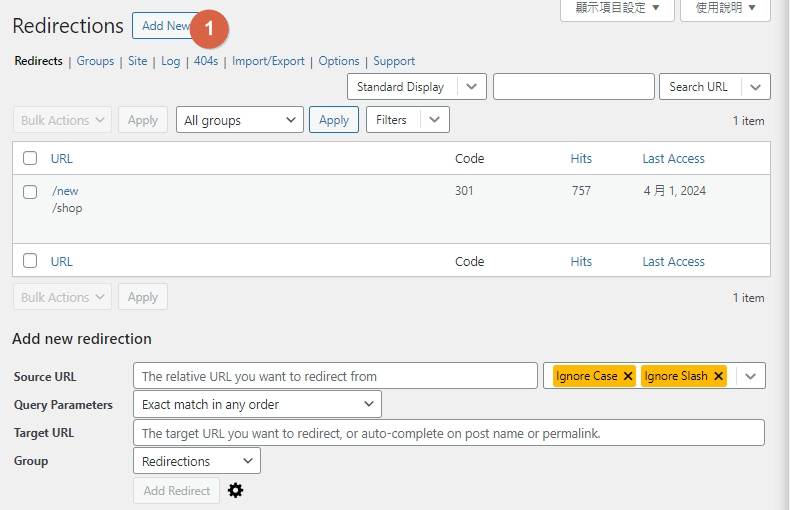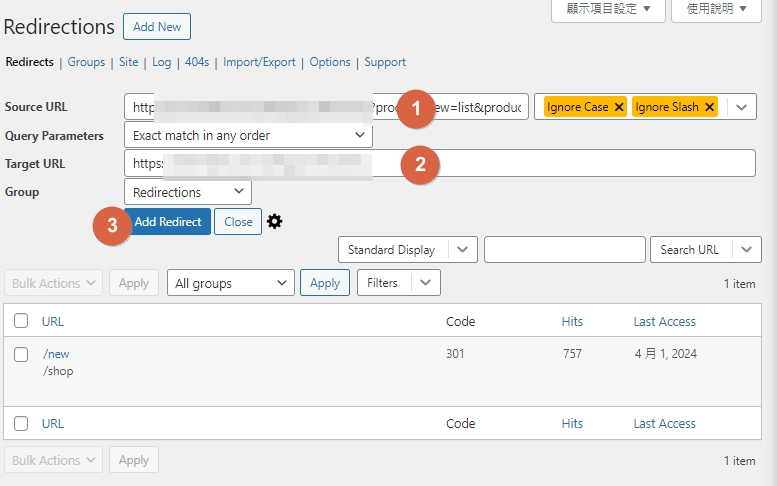 在「Source URL」輸入想要跳轉之前的網址,在「Target URL」輸入想要跳轉之後的網址,最後按下「Add Redirect」即可新增完成: